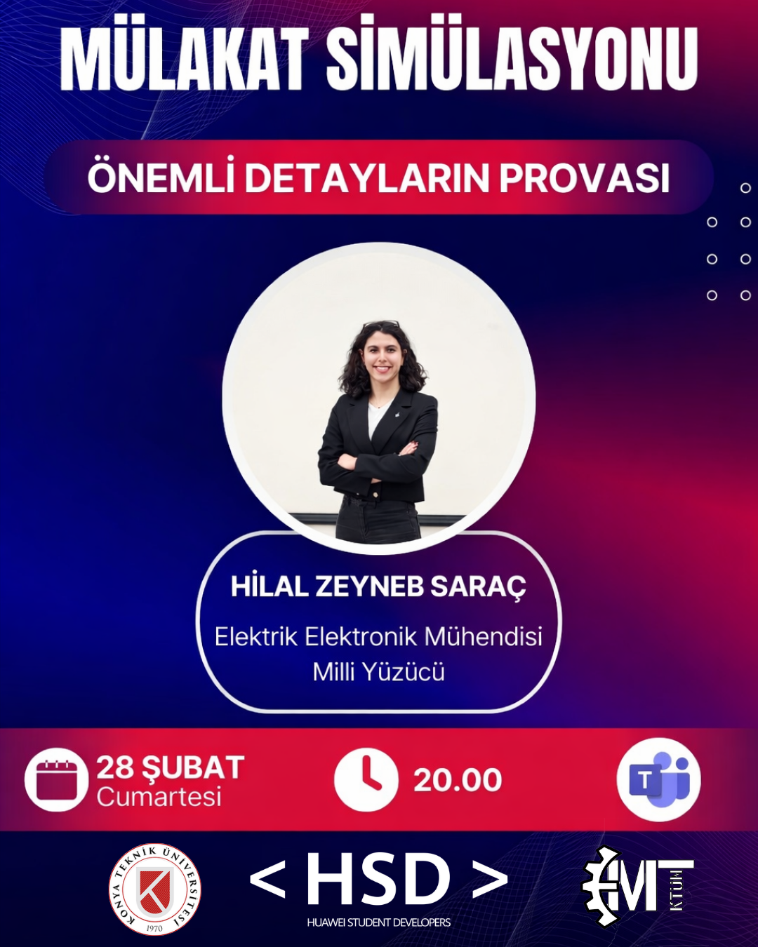 Milli yüzücü ve bir mühendis olan Hilal Zeyneb SARAÇ hanımefendinin katılımıyla Microsoft Teams platformu üzerinden online şekilde gerçekleştirilecek bir mülakat simülasyonu.