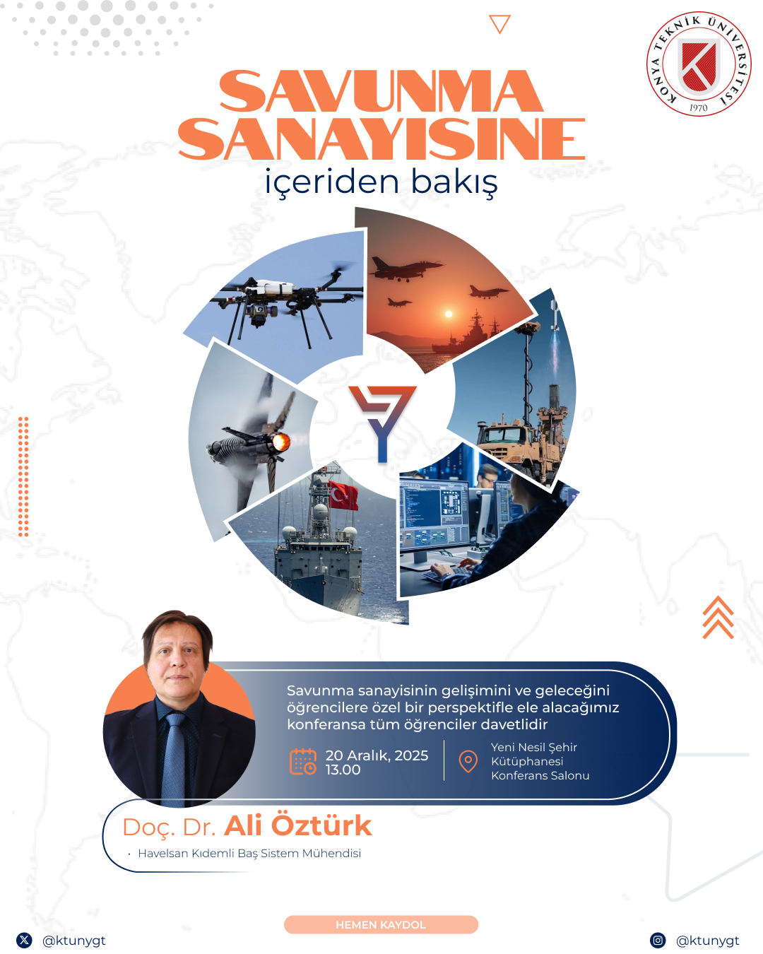Bu konferans, Türkiye'nin stratejik öneme sahip savunma sanayisinin gelişim sürecini ve gelecek vizyonunu, sektörün kalbinde yer alan bir uzmanın (Havelsan Kıdemli Baş Sistem Mühendisi) gözünden ele almaktadır. Etkinlik, sadece teknolojik gelişmeleri değil, aynı zamanda savunma projelerinin perde arkasındaki mühendislik süreçlerini, sistem mühendisliğinin önemini ve yerli teknolojilerin evrimini kapsamaktadır. Özellikle öğrencilere yönelik bir perspektifle; sektörün genç yeteneklerden beklentileri, kariyer fırsatları ve geleceğin savunma teknolojilerinde yer almak isteyen mühendis adaylarının kazanması gereken yetkinlikler masaya yatırılacaktır.