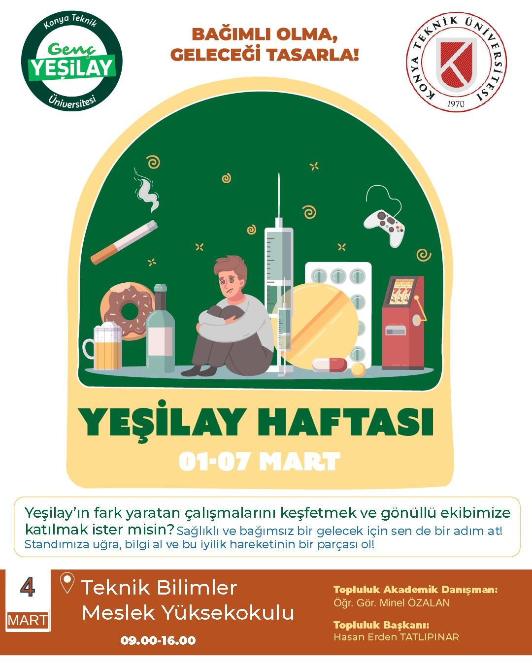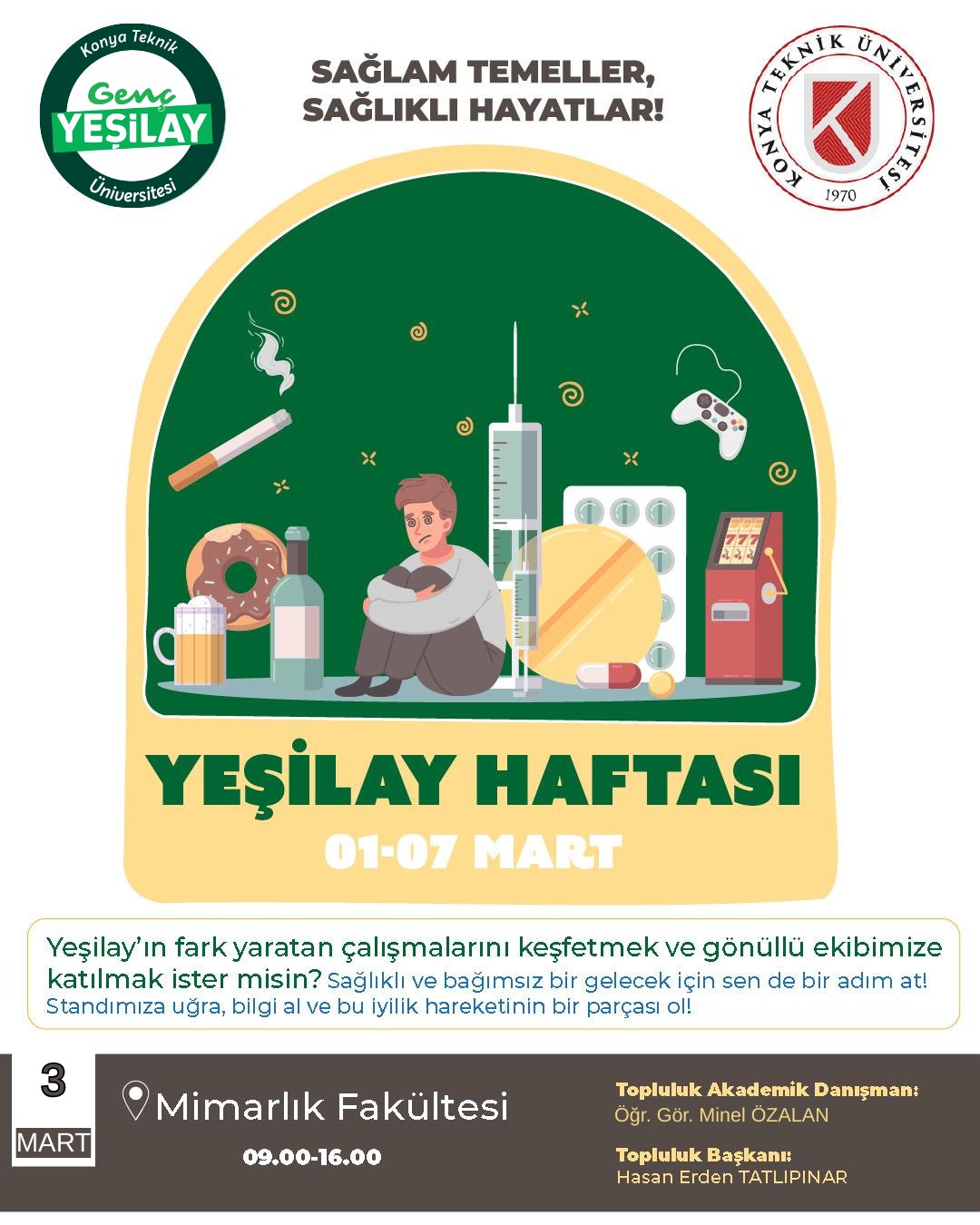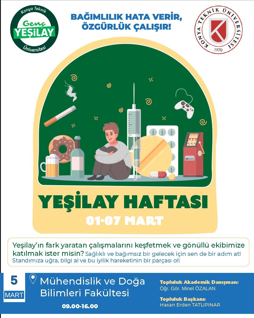 1-7 Mart Yeşilay Haftası Kapsamında genç yeşilay topluluğunun faliyetleri hakkında bilgi vermek ve topluluğumuza yeni üyeler kazandırmak.