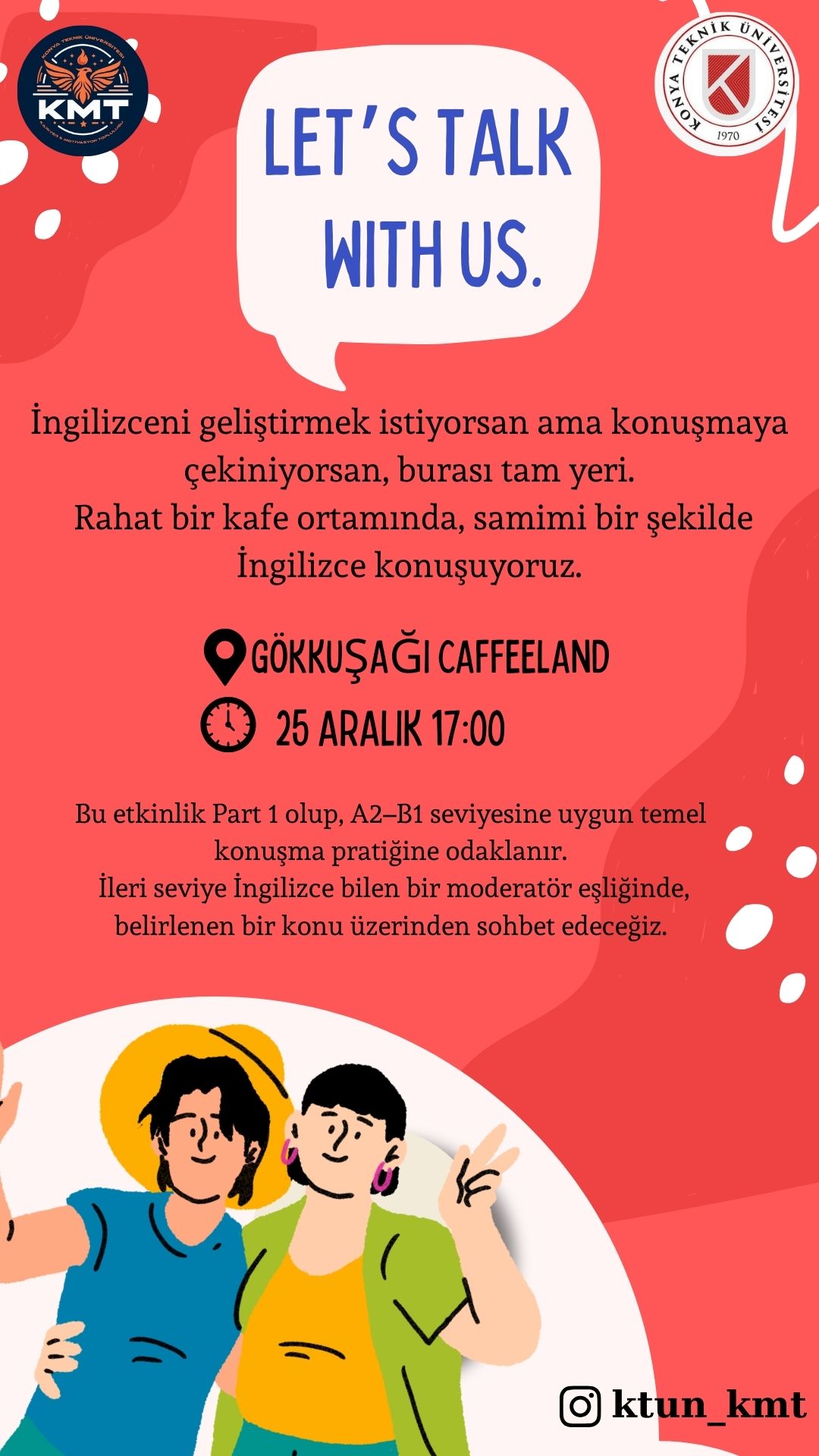 Katılımcıların İngilizce konuşma becerilerini geliştirmeye yönelik; günlük yaşam, akademik ve profesyonel konular üzerinden aktif, etkileşimli ve uygulamalı konuşma etkinlikleri içeren bir speaking club organizasyonu.
