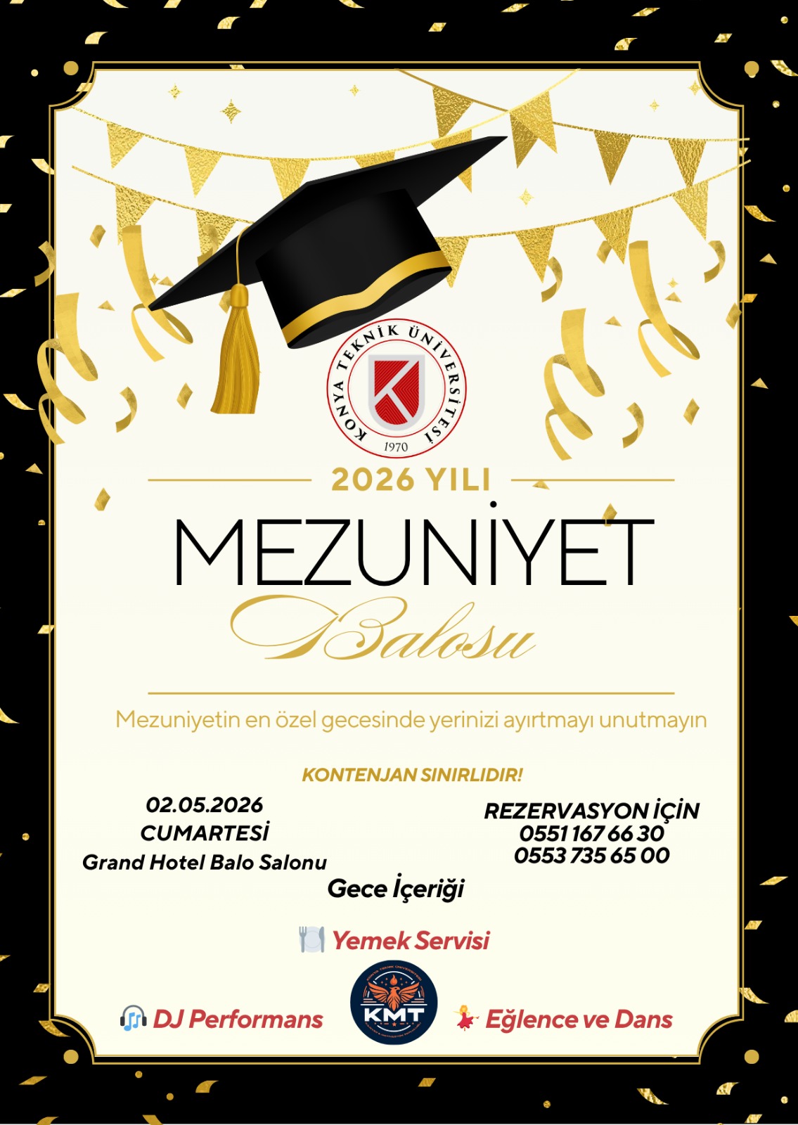 2026 Mezuniyet Balosu, öğrencilerimizin yıllar süren emek ve akademik yolculuklarının taçlandırılacağı özel bir organizasyondur. 02 Mayıs 2026 tarihinde Grand Hotel Balo Salonu’nda gerçekleştirilecek etkinlikte yemek servisi, DJ performansı, eğlence ve dans programı yer alacaktır. Katılımcılara hem mezuniyet coşkusunu yaşayabilecekleri hem de unutulmaz anılar biriktirebilecekleri nitelikli ve düzenli bir gece sunulması hedeflenmektedir. Kontenjan sınırlı olup rezervasyon ile katılım sağlanacaktır.