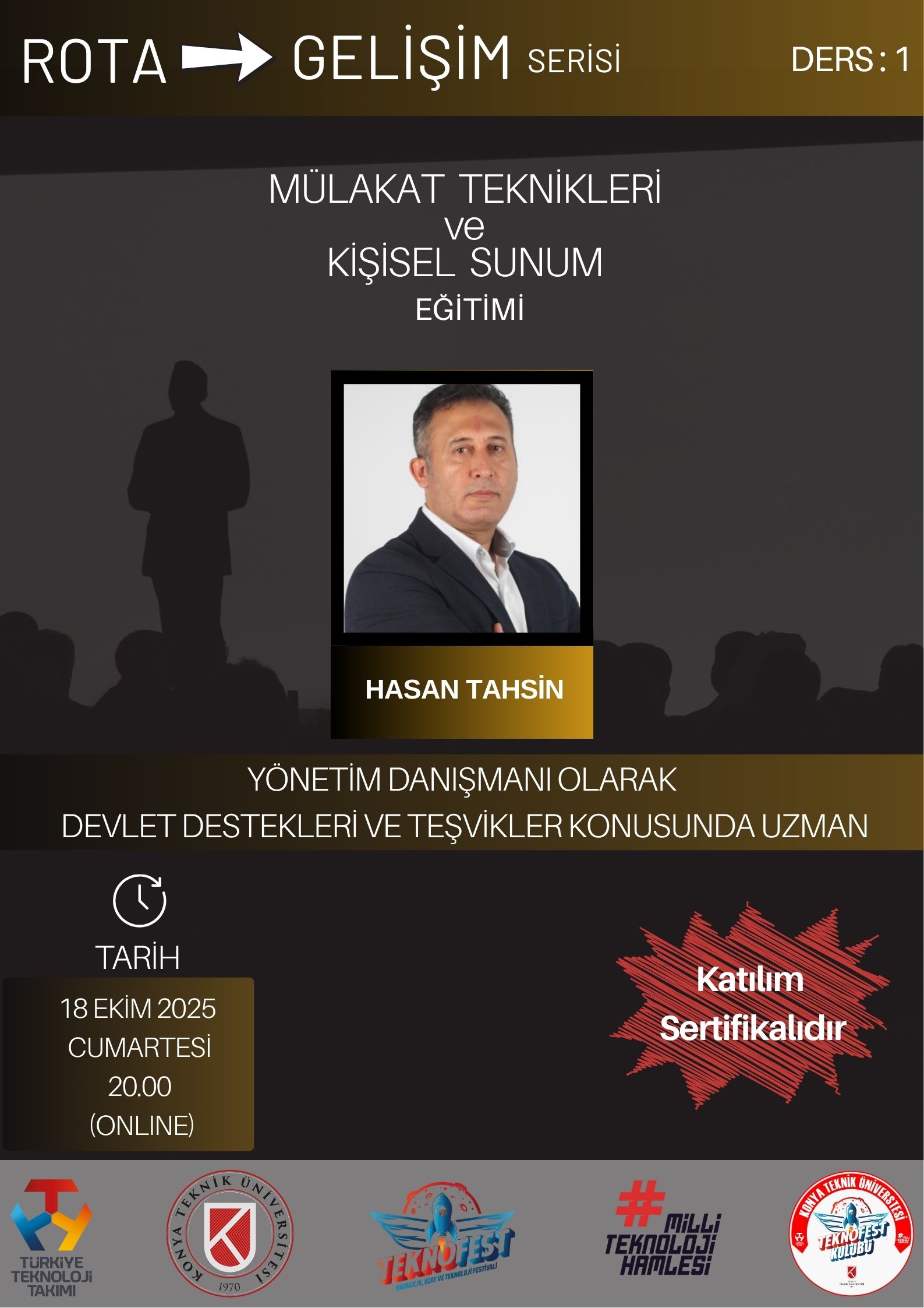 Bu eğitim, üniversite öğrencilerinin mülakat süreçlerinde başarılı olabilmeleri ve etkili kişisel sunum becerilerini geliştirebilmeleri amacıyla düzenlenmiştir. Katılımcılar, mülakat hazırlığı, sık sorulan sorulara yanıt verme, beden dili kullanımı ve profesyonel sunum teknikleri konularında bilgi ve uygulama fırsatı bulacaktır.