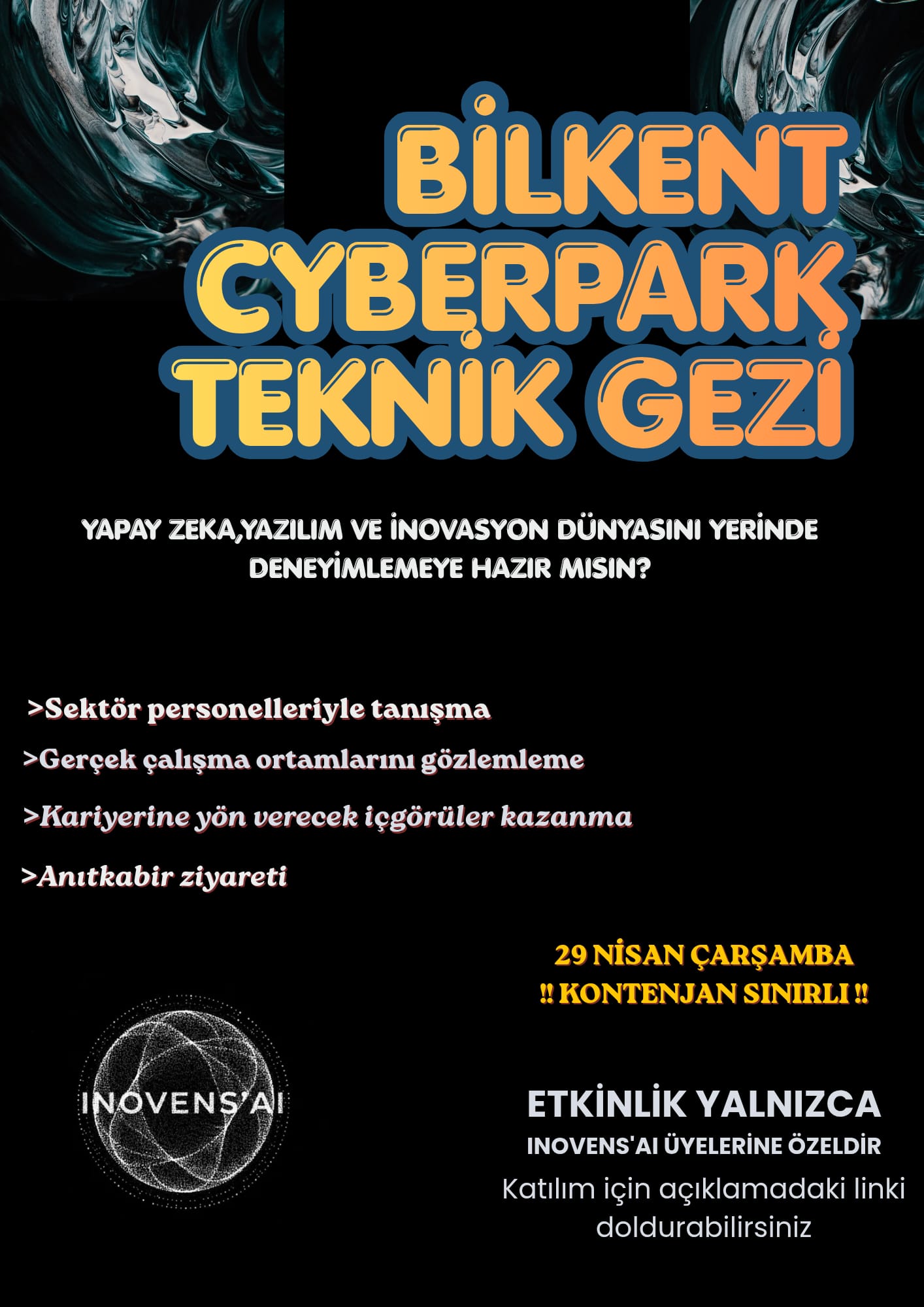 INOVENS'AI topluluğu olarak düzenlenen bu teknik gezi kapsamında, Ankara’da bulunan Bilkent Cyberpark yerleşkesine ziyaret gerçekleştirilerek; yapay zeka, yazılım geliştirme, siber güvenlik ve ileri teknoloji alanlarında faaliyet gösteren firmaların çalışma ortamlarının yerinde incelenmesi amaçlanmaktadır. Etkinlik ile öğrencilerin teorik olarak edindikleri bilgileri gerçek sektör uygulamaları ile ilişkilendirmeleri, teknoloji firmalarının iş süreçlerini gözlemlemeleri ve alanında uzman profesyonellerle doğrudan iletişim kurarak kariyer farkındalığı kazanmaları hedeflenmektedir. Bu doğrultuda etkinlik, üniversite-sanayi iş birliğini destekleyen, öğrencilerin mesleki gelişimlerine katkı sağlayan ve yapay zekanın farklı disiplinlerdeki uygulamalarını yerinde gözlemleme imkanı sunan bir teknik inceleme gezisi niteliğindedir.