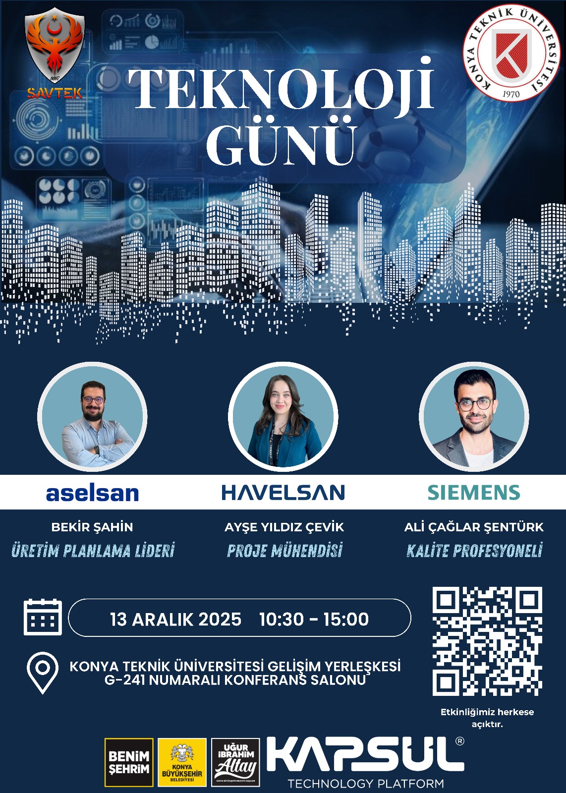 Konya Teknik Üniversitesi Savunma Teknolojileri Topluluğu (SAVTEK) tarafından düzenlenen Teknoloji Günü, savunma, havacılık ve ileri teknoloji alanlarındaki güncel gelişmeleri ele alarak öğrencileri sektörün deneyimli mühendisleriyle buluşturmayı amaçlamaktadır. Etkinlik; katılımcıların teknolojik yenilikleri uzmanlardan dinlemesini, sektörel farkındalık kazanmasını ve profesyonel kariyerlerine ışık tutacak bağlantılar geliştirmesini sağlayacak bir buluşma niteliği taşımaktadır.